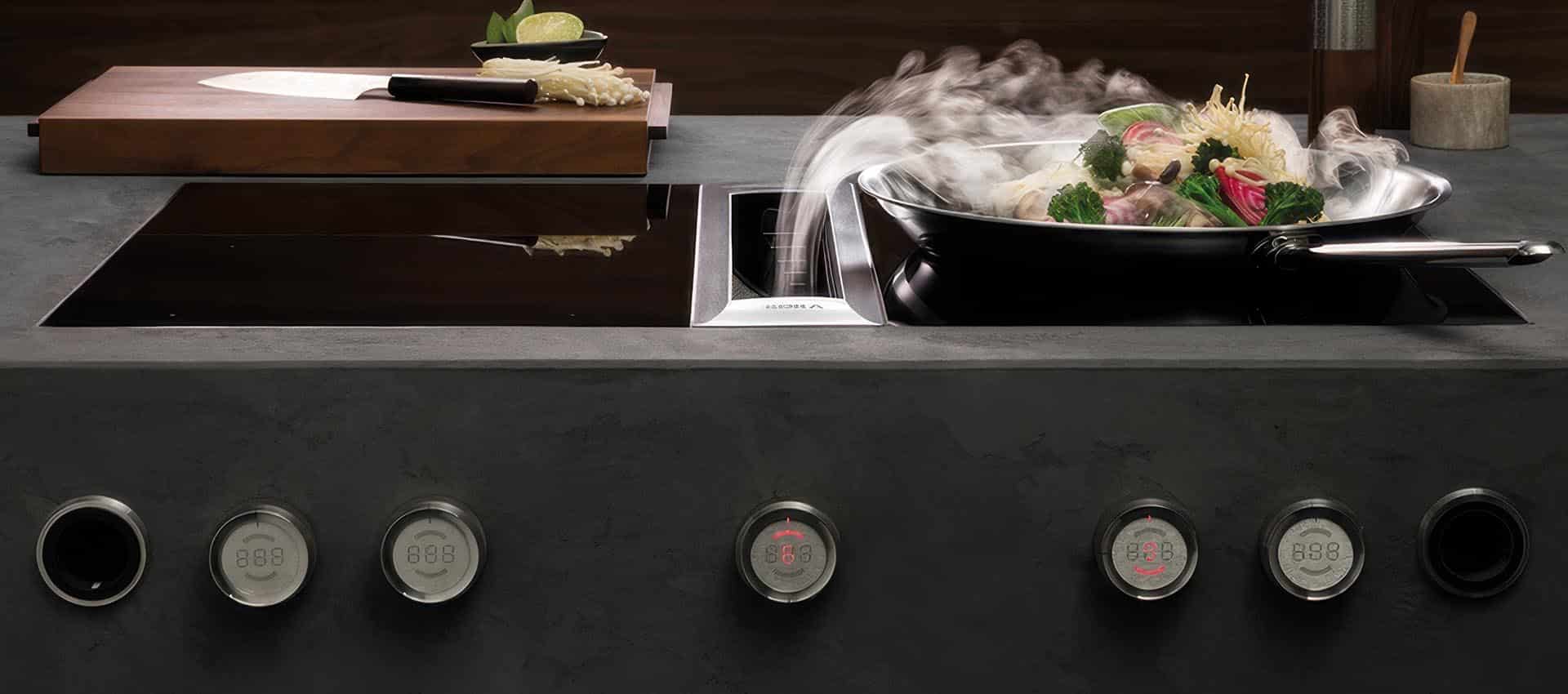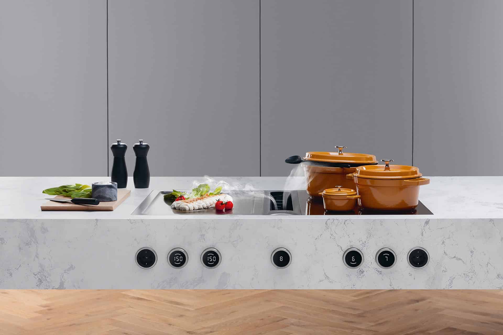 Revolutionär ist die zentrale Steuerung – ganz ohne Kochflächenverlust. Erstmals bei einem modularen System im Einsatz, zieht sie nicht nur alle Blicke auf sich. Die Bedienung erfolgt über einfaches Rauf-/Runterbewegen des Fingers. Sämtliche, wichtigen Funktionen sind intuitiv über einen einzigen Tastendruck erreichbar. In Summe: topästhetisches, ausgesprochen leises Kochen mit 4 bis zu 24 cm großen Töpfen gleichzeitig – bei größtmöglicher Auswahl an Kochfeldern. Höchste Flexibilität für die individuelle Küche.
